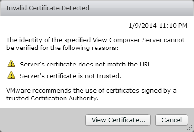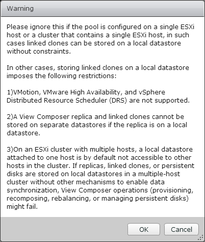 Note: After you have configured the Replica Datastore, you may receive the following warning about storing Replicas and Linked Clones on local datastores. If you are using a SAN or a NAS and not storing any Replicas or Linked Clones on local datastores, you can ignore this message.