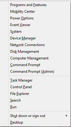 When Microsoft replaced the Start Menu with Metro in Windows 8, they kept something similar to the old Start menu that could be accessed by pressing Win+X. This menu, shown below, retained a layout that was similar to the start menu and could be used to access various systems management utilities that were hidden by Metro.