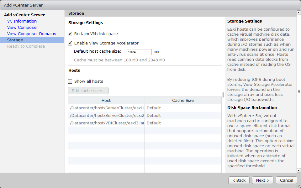 - Enable View Storage Accelerator – View Storage Accelerator is a RAMDISK cache that can be used to offload some storage requests to the local system. Regenerating the cache can impact IO operations on the storage array, and maintenance blackout windows can be configured to avoid a long train of witnesses. The max cache size is 2GB.
