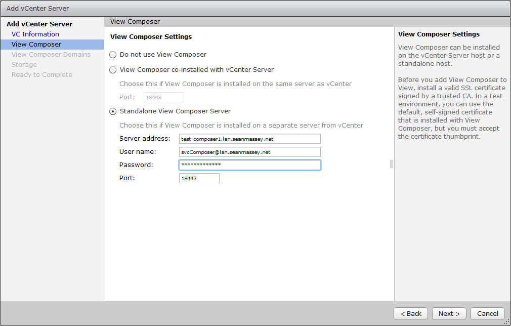 C. Standalone View Composer Server – View Composer is installed on a standalone Windows Server, and credentials will be required to connect to the Composer instance. This option will work with both the Windows vCenter Server and the vCenter Server virtual appliance.