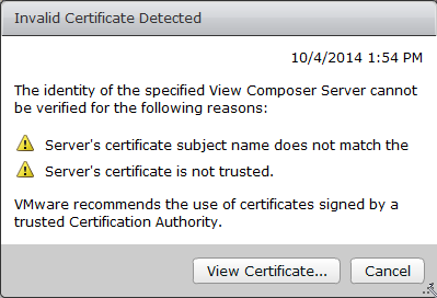 4. If you have not updated the certificates on your vCenter Server, you will receive an Invalid Certificate Warning. Click View Certificate to view and accept the certificate.