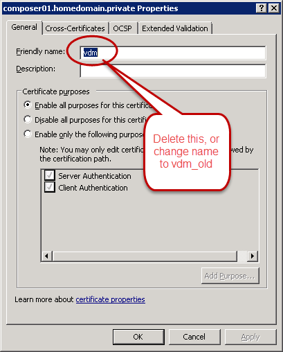 Unfortunately, Horizon Composer uses a different method of managing certificates. Although the certificates are still stored in the Windows Certificate store, the process of replacing Composer certificates is a little more involved than just changing the friendly name.