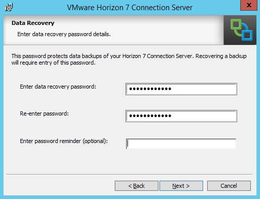 6. Enter a strong password for data recovery. This will be used if you need to restore the Connection Server’s LDAP database from backup. Make sure you store this password in a secure place. You can also enter a password reminder or hint, but this is not required.